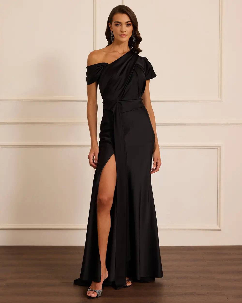 - asimetrik yaka yırtmaçlı saten abiye
