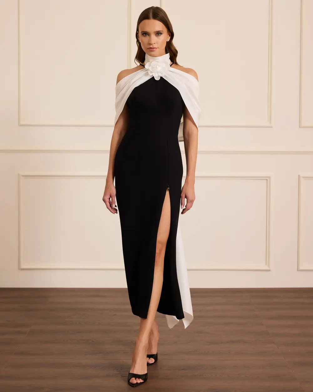 - crepe evening dress with removable accessories