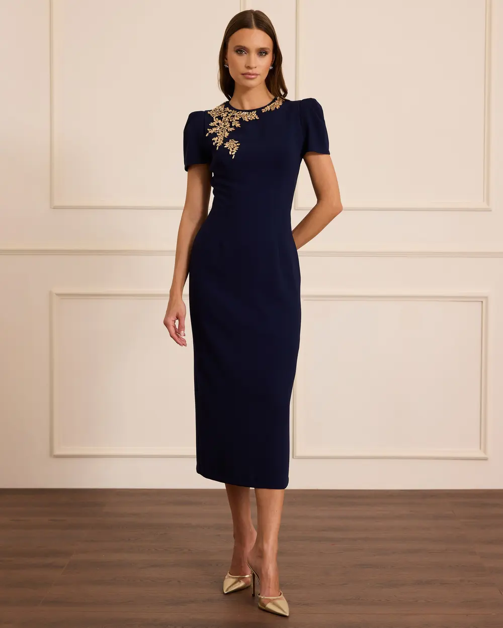- stone detailed short sleeve midi evening dress