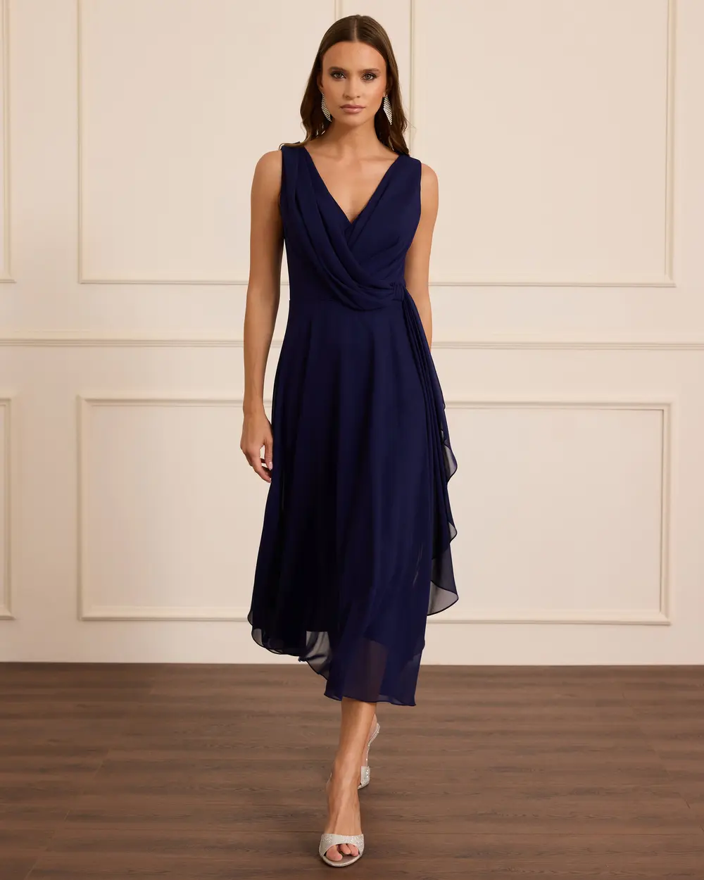 - chiffon sleeveless midi evening dress