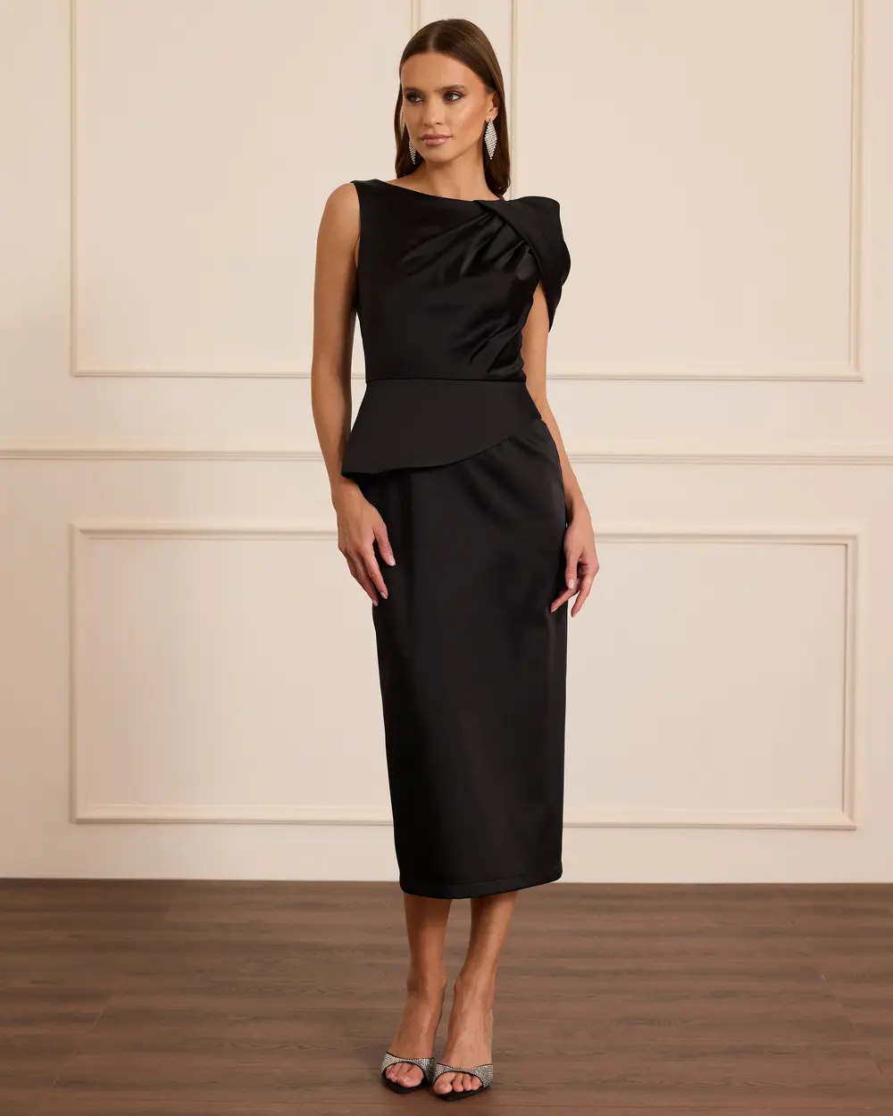 - draped midi length elegant crepe dress
