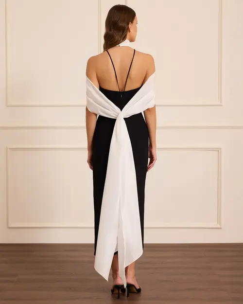 Crepe evening dress with detachable accessories offers a versatile and stylish use with its zippered slit detail and simple crepe texture.