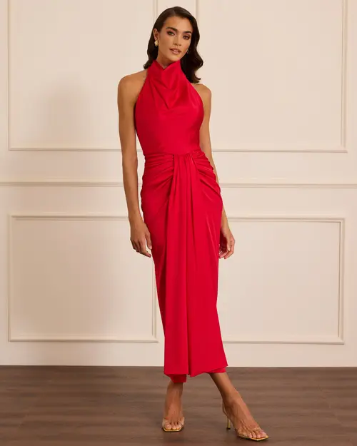 Degaje Collar Draped Satin Evening Dress offers an elegant and feminine stance with its flowing satin texture and draped form.