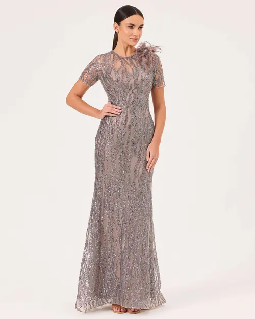 feather detailed short sleeve slim fit evening dresses