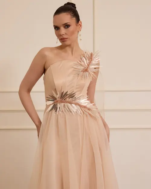 Organza Flared Evening Dress with Accessory Details offers a voluminous and elegant look with its light organza texture and elegant accessory decorations.
