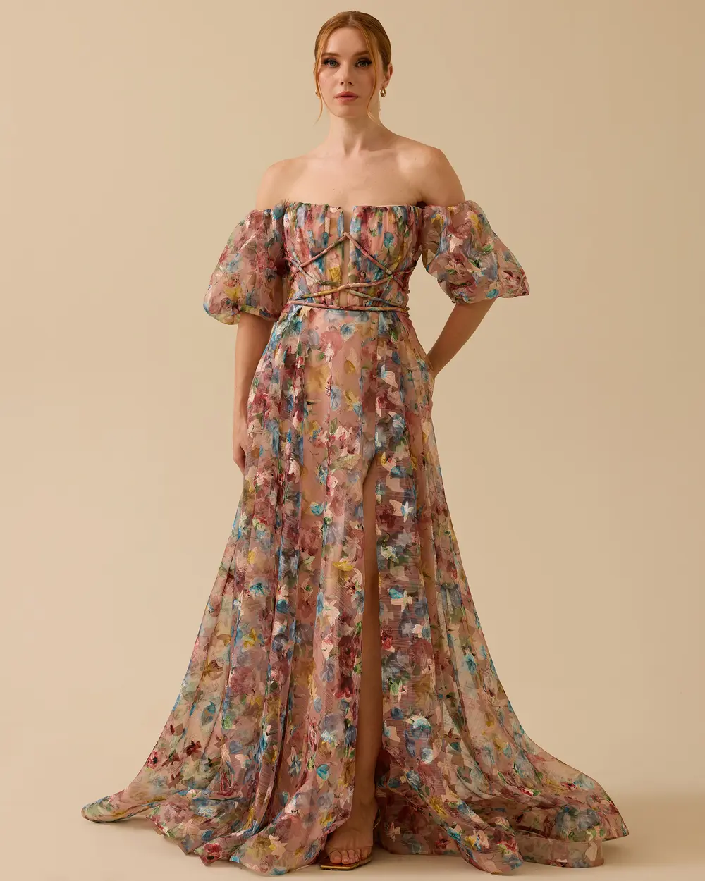 - çiçek desenli yırtmaçlı balon kollu abiye
