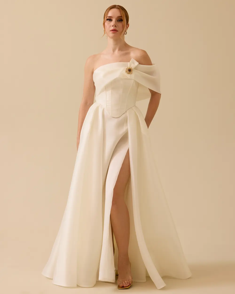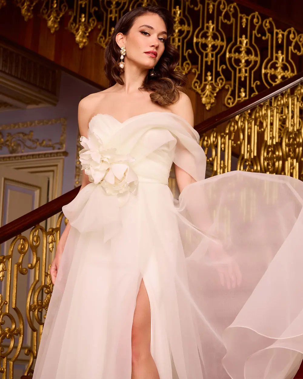 - çiçek aksesuarlı organze kumaş yırtmaçlı abiye