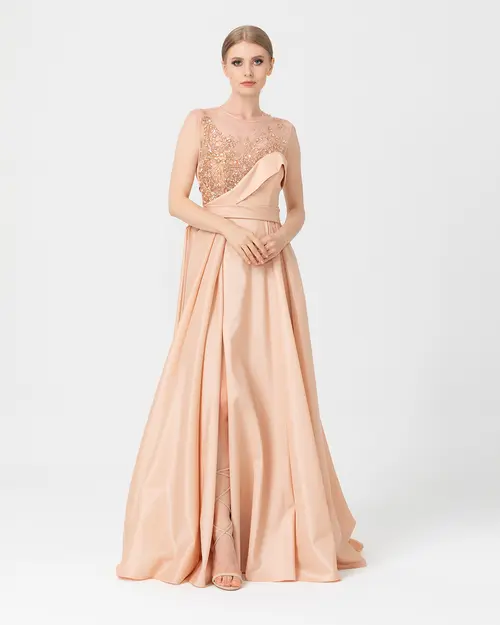 A kesim tasarımı ve transparan yaka detayı ile öne çıkan bu tafta abiye elbise, şıklığın zirvesini temsil ediyor. Işıltıları ve zarif kesimiyle unutulmaz bir geceye hazır olun.