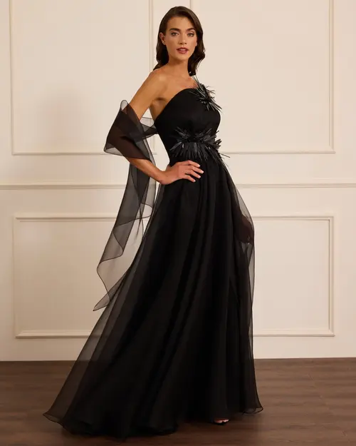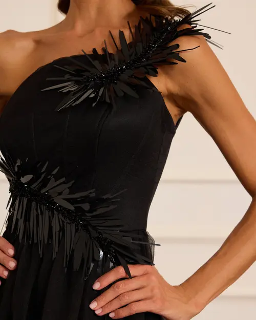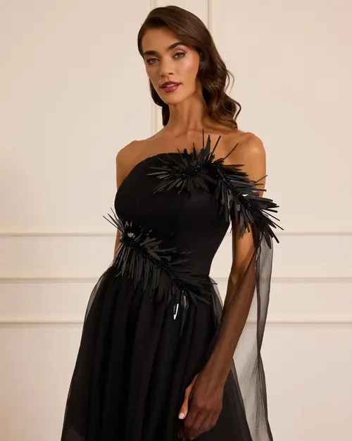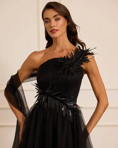 Aksesuar Detaylı Organze Kloş Abiye, hafif organze dokusu ve zarif aksesuar süslemeleriyle hacimli ve elegant bir görünüm sunar.