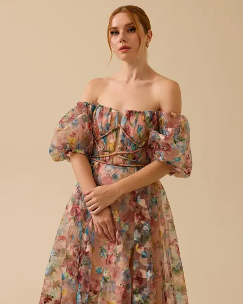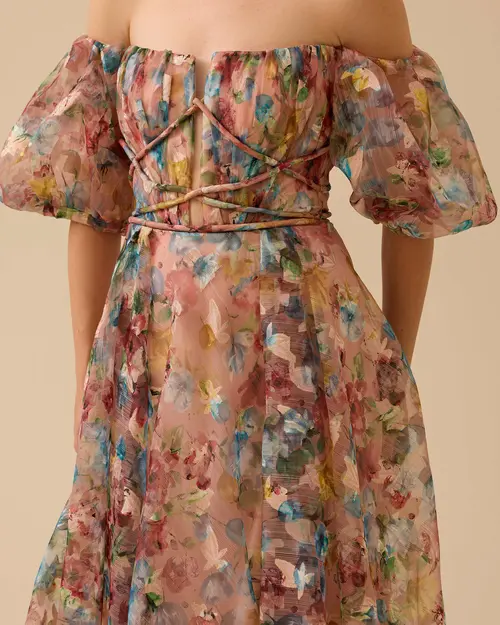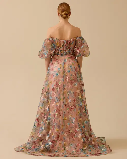 Çiçek Desenli Yırtmaçlı Balon Kollu Abiye, omzu açık tasarımı ve feminen detaylarıyla zarif bir görünüm sunar.