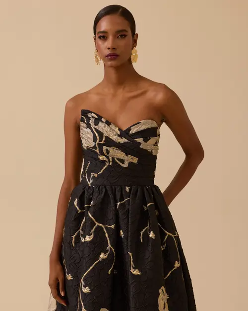 Asimetrik yaka tasarımıyla modern bir hava kazanan cepli desenli abiye, özgün detaylarıyla dikkat çekiyor. Hareketli deseni ve pratik cepleriyle şıklığı konforla buluşturan bu model, özel davetler için ideal bir seçimdir.