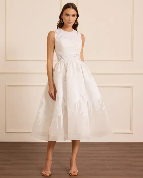 Çıkarılabilir fular detaylı midi kloş abiye, zarif kesimi ve çok yönlü tasarımıyla şıklık sunar.