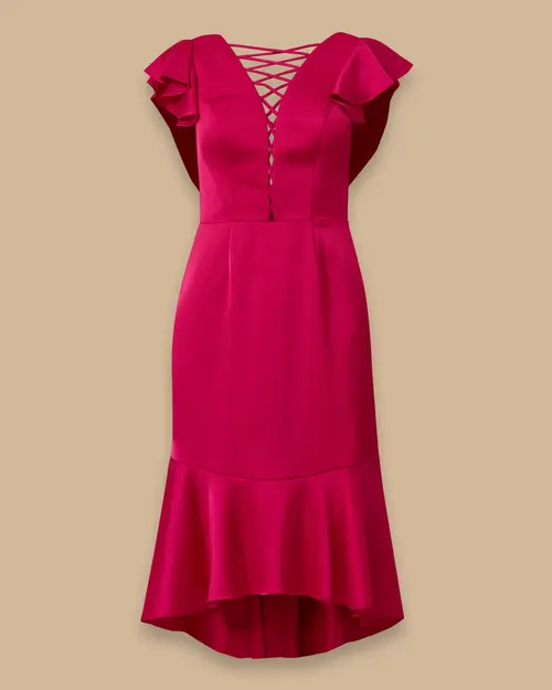 Dar formdaki bu volanlı saten abiye elbise, şık V yaka tasarımı ile öne çıkıyor. Saten kumaşı ve sofistike volan detaylarıyla her özel etkinlikte zarafetin simgesi olun.