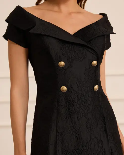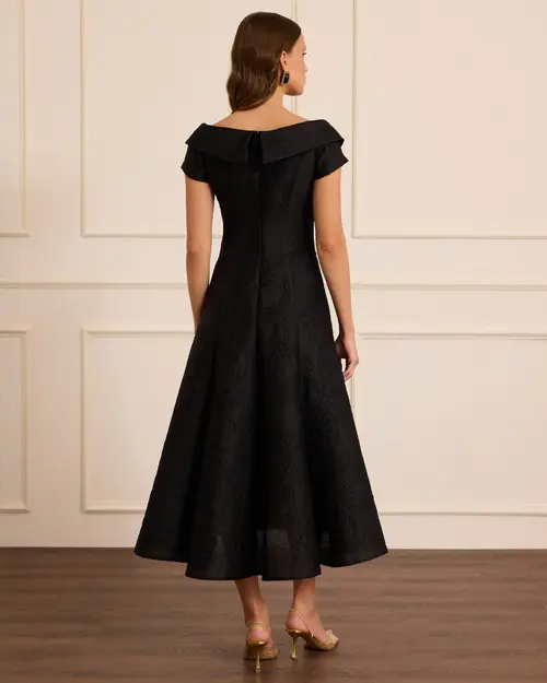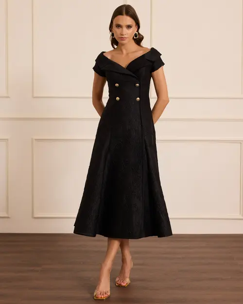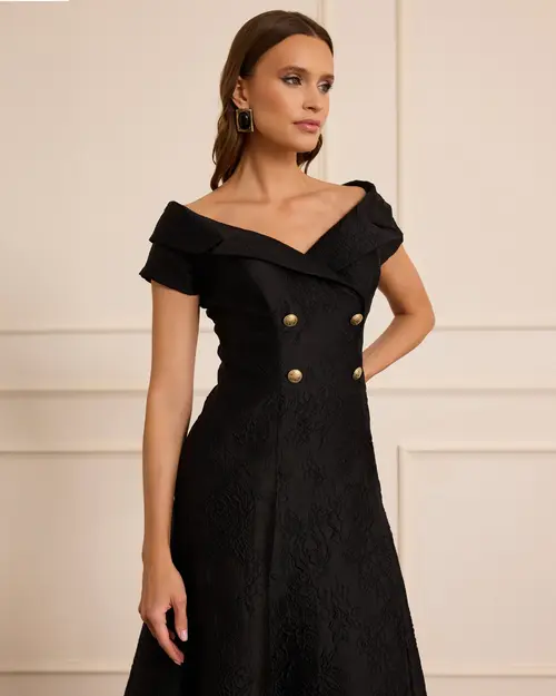 Desenli Düğme Detaylı Midi Abiye, şık desenleri ve zarif düğme detaylarıyla modern bir tarz sunar.