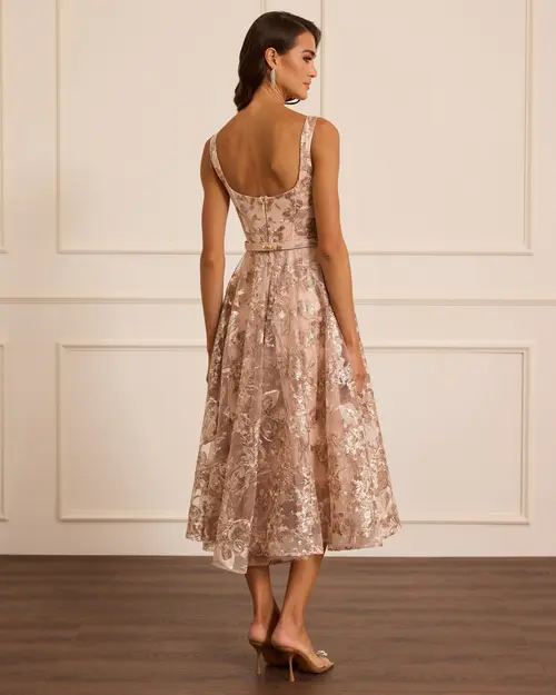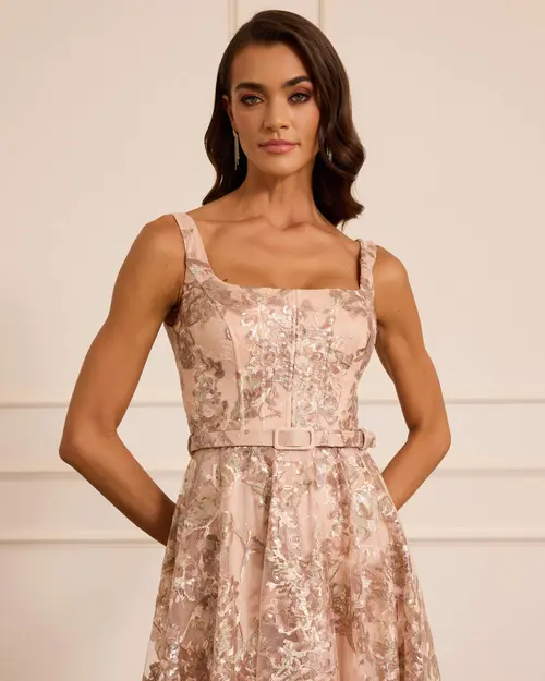Kare Yaka Desenli Kemerli Abiye, kemer detayı ve çiçek desenli dokusuyla dengeli ve zarif bir siluet sunar.