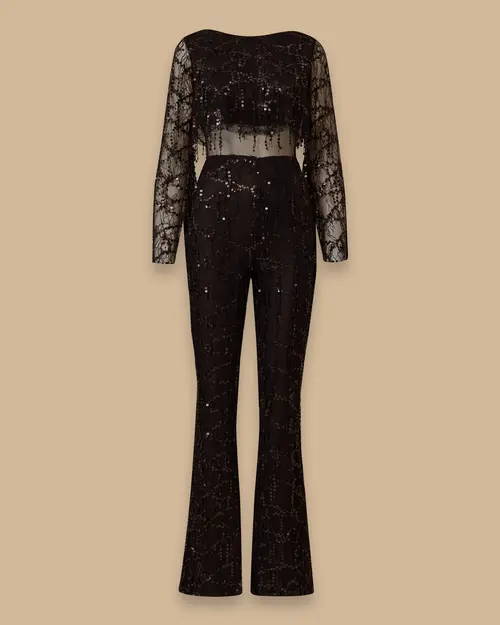 Payet işlemeli geniş paçalı dantel abiye tulum, şıklığı ve cesareti bir araya getiriyor. Parıltılı detayları ve modern tasarımıyla her özel etkinlikte göz alıcı bir seçenek sunar. Unutulmaz bir stil için idealdir.