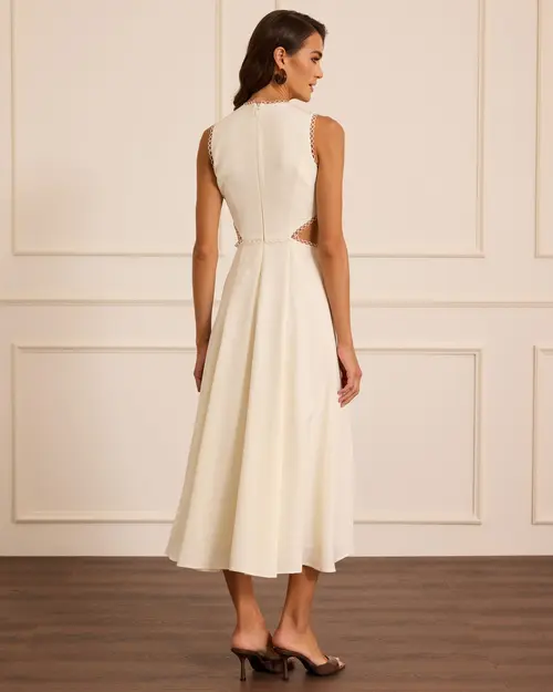 Pencere Detaylı Kolsuz Keten Abiye, nefes alabilen keten dokusu ve modern pencere kesimiyle doğal ve şık bir görünüm sunar.