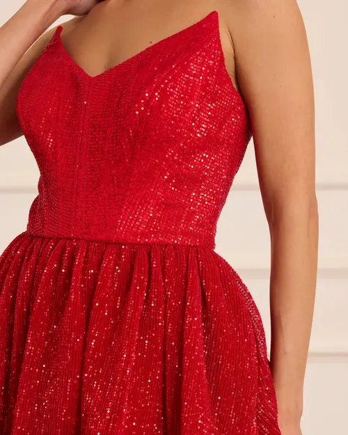 Straplez Mini Payet Abiye, ışıltılı payet dokusu ve straplez kesimiyle modern ve iddialı bir şıklık sunar.