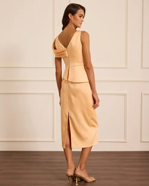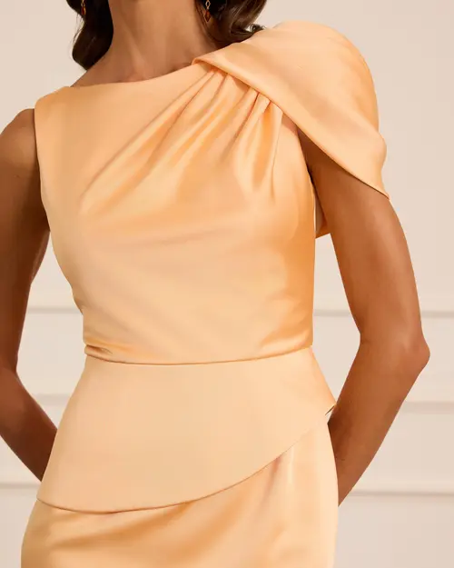 Tek Omuz Saten Midi Abiye, akıcı saten dokusu ve zarif tek omuz tasarımıyla modern ve şık bir siluet sunar.