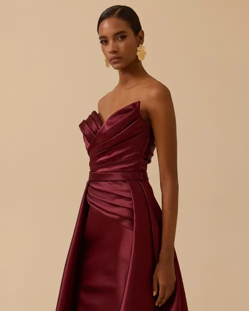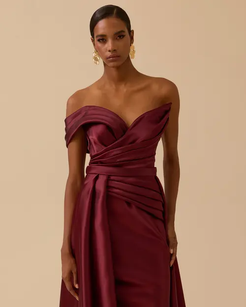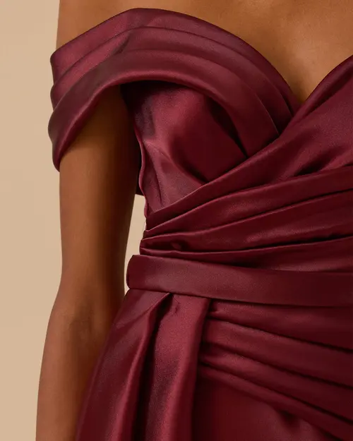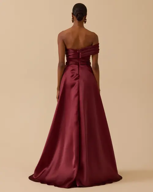 Düşük Omuz Drapeli Saten Abiye, zarif drape detayları ve ışıltılı saten dokusuyla göz alıcı bir şıklık sunar.