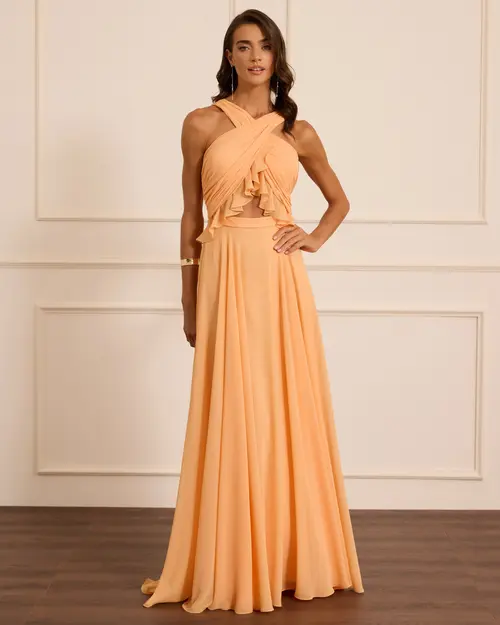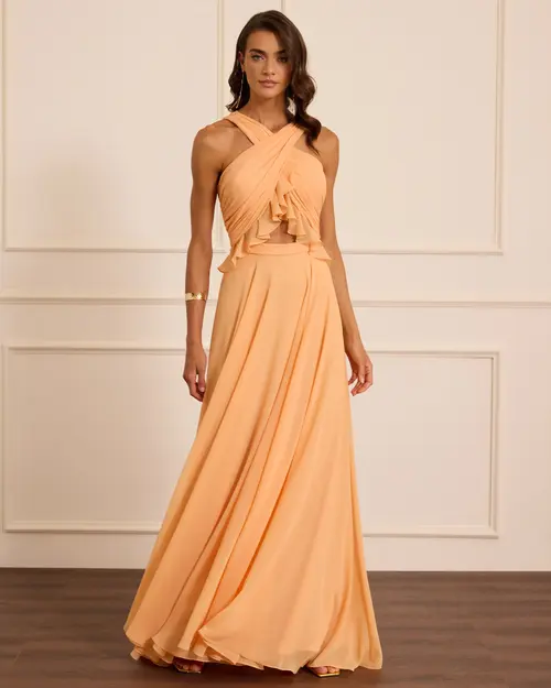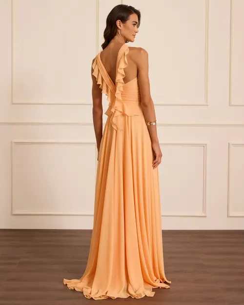 Fırfır Detaylı Uzun Form Abiye, pencere detayı ve akıcı formuyla zarif ve modern bir siluet sunar.