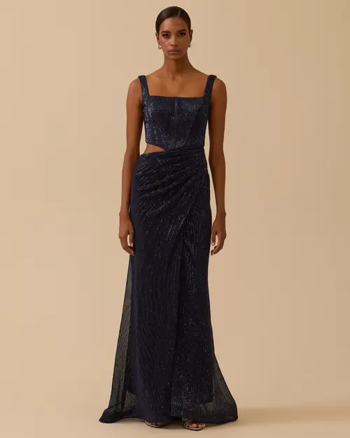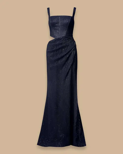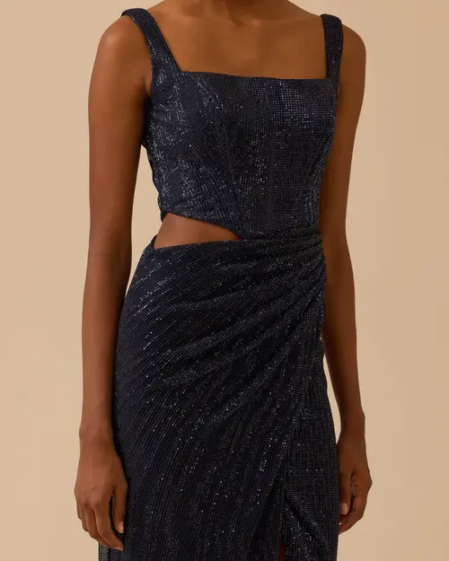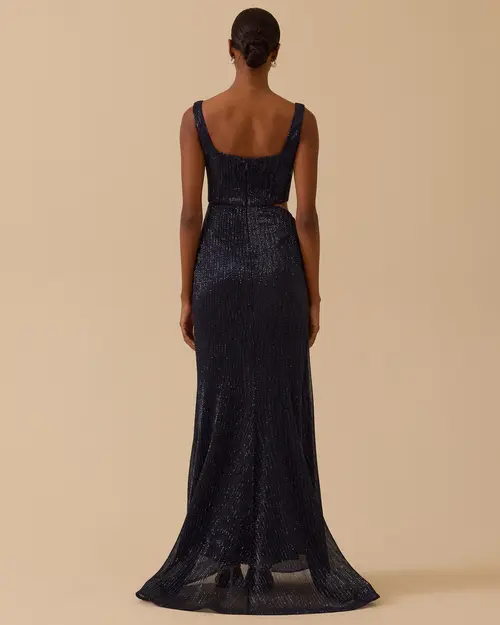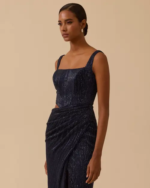 Kare Yaka Yırtmaçlı Payetli Abiye, ışıltılı payet detaylarıyla göz alıcı bir görünüm sunar. Modern tasarımı ve yırtmaç detayıyla özel gecelerde zarif bir şıklık yaratır.