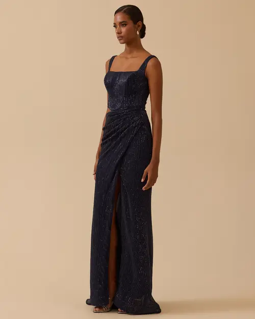 Kare Yaka Yırtmaçlı Payetli Abiye