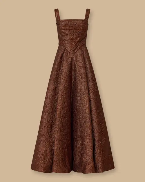 Korsajlı Askılı Jakar Elbise, desenli jakar kumaşı, cep detayı ve korsaj formuyla zarif ve fonksiyonel bir şıklık sunar.