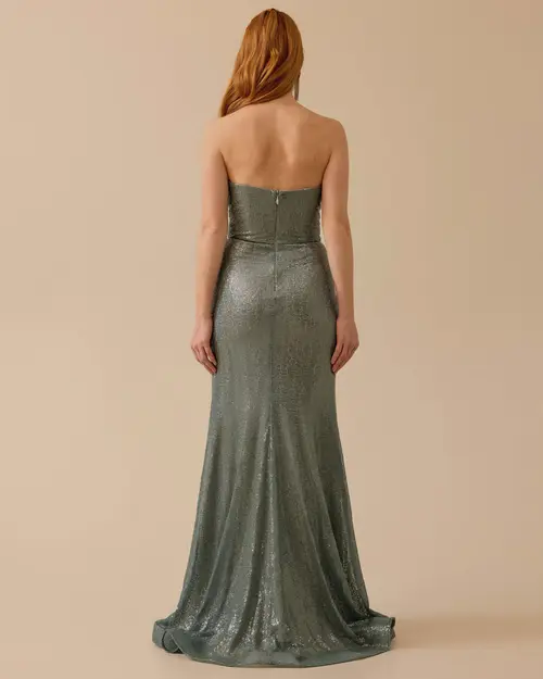 Payetli Balık Form Yırtmaçlı Abiye, ışıltılı payet dokusu ve yırtmaç detayıyla göz alıcı bir siluet sunar.