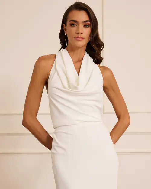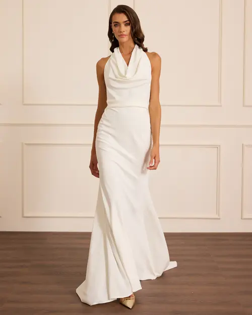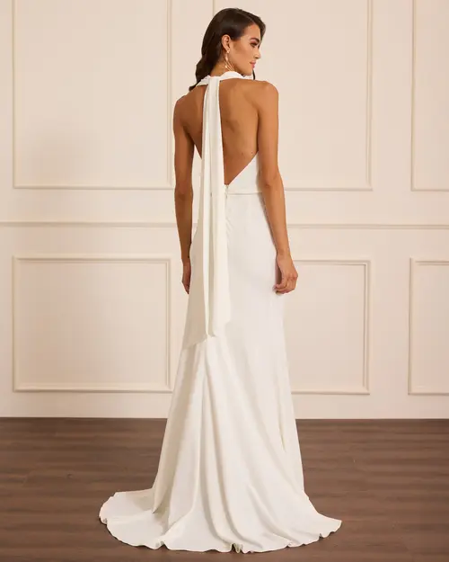 Sırt Dekolteli Degaje Yaka Abiye,degaje yaka tasarımı ve sırt kısmındaki bağlama detayıyla dikkat çeken bu abiye elbise, feminen bir şıklık sunuyor. Vücuda oturan kesimi ve hafif kuyruklu eteğiyle özel davetlerde zarafet dolu bir görünüm sağlıyor.
