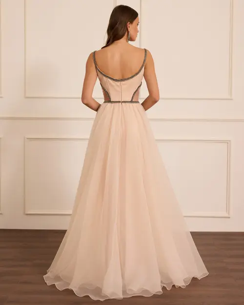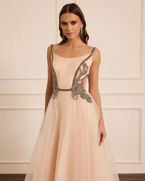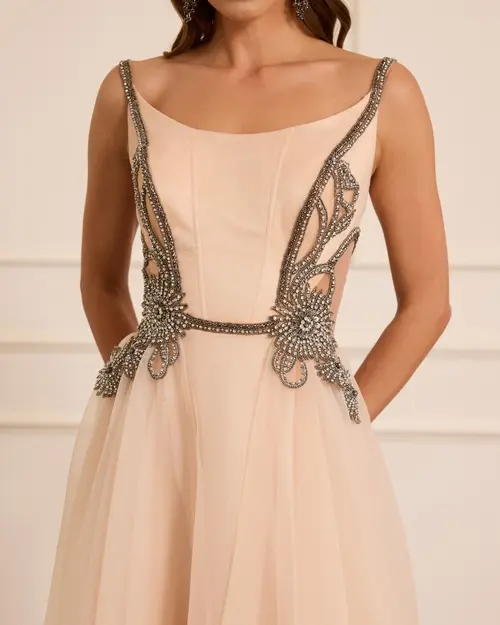 Taş İşlemeli Askılı Abiye, parlak taş süslemeleri ve zarif askılarıyla göz alıcı bir seçim.