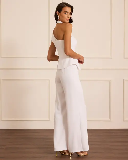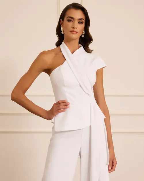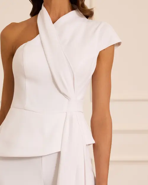 Tek Omuz Bağlama Detaylı Abiye Tulum, modern kesimi ve zarif drape detayıyla şık bir görünüm sunar.