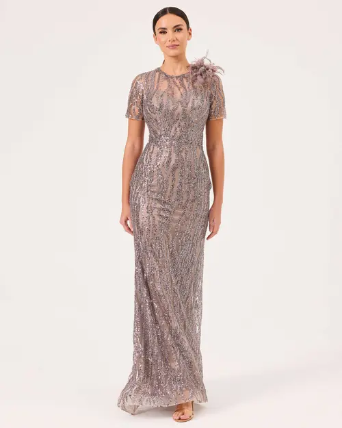 Tüy Detaylı Kısa Kollu Dar Form Abiye, zarif tüy işlemeleri ve vücuda oturan şık kesimiyle göz alıcı bir görünüm sunar.