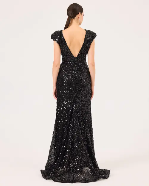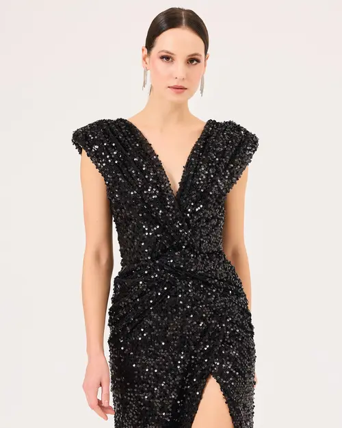V Yaka Drapeli Payet Abiye, ışıltılı payetleri, drapeli formu ve yırtmaç detayıyla şık ve iddialı bir görünüm sunar.