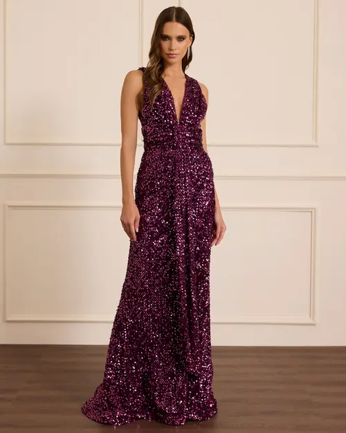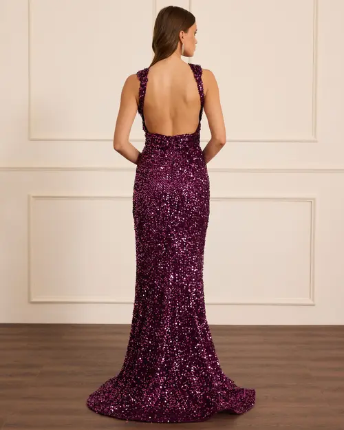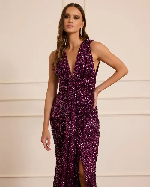 V Yaka Sırt Dekolteli Payet Abiye, ışıltılı payetleri ve zarif sırt detayıyla şık görünüm sunar.